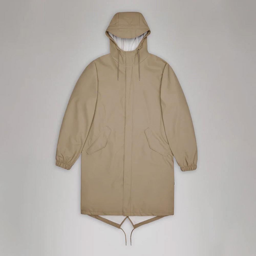 Fishtail Parka est un imperméable unisexe caractérisé par son esthétique sobre et son arrière queue de poisson avec cordon de serrage. Le design est décontracté et comporte un ourlet en biais. La fermeture éclair est masquée par une patte sobre dotée de boutons-pression. Fishtail Parka comporte des poches, des poignets élastiques et une capuche avec cordon de serrage, caractéristiques de Rains.